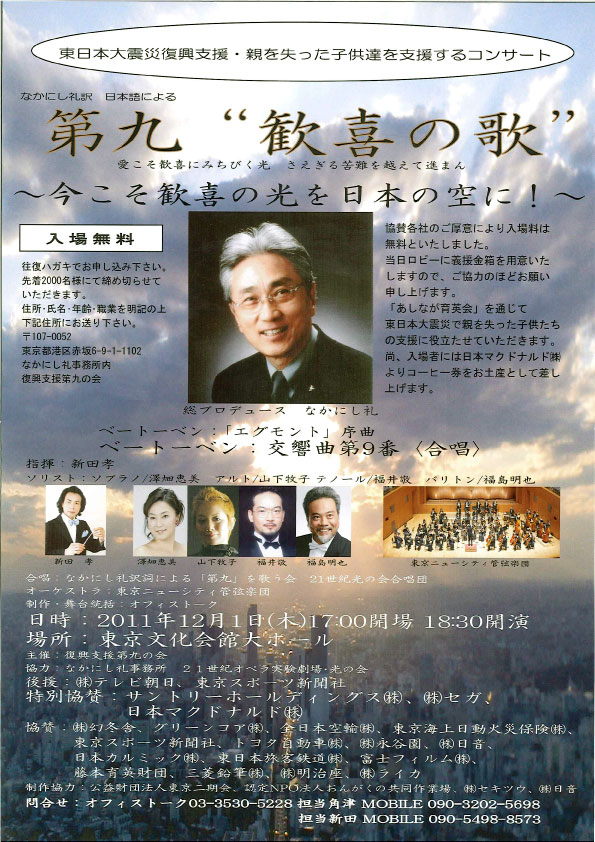 2011年11月04日 もうこんな季節ですね。第九コンサート! なかにし礼先生プロデュース第九"歓喜の歌"復興支援コンサート!12月1日開催へ。 株式会社ケーズ・クルーも業務で応援します! 【スタッフ募集中】 このコンサートを含め、アルバイトスタッフを募集しております。詳細はオフィシャルホームページかお電話やメールにて。 株式会社ケーズ・クルー TEL:03-5363-3901 タグ :#コンサート#スタッフ#募集#ケーズクルー#アルバイト 「イベント運営系」カテゴリの最新記事 「只今募集中【求人情報】」カテゴリの最新記事 < 前の記事次の記事 > コメント このブログにコメントするにはログインが必要です。 さんログアウト この記事には許可ユーザしかコメントができません。 コメントフォーム 名前 コメント 評価する リセット リセット 顔 星 投稿する 情報を記憶 トラックバック