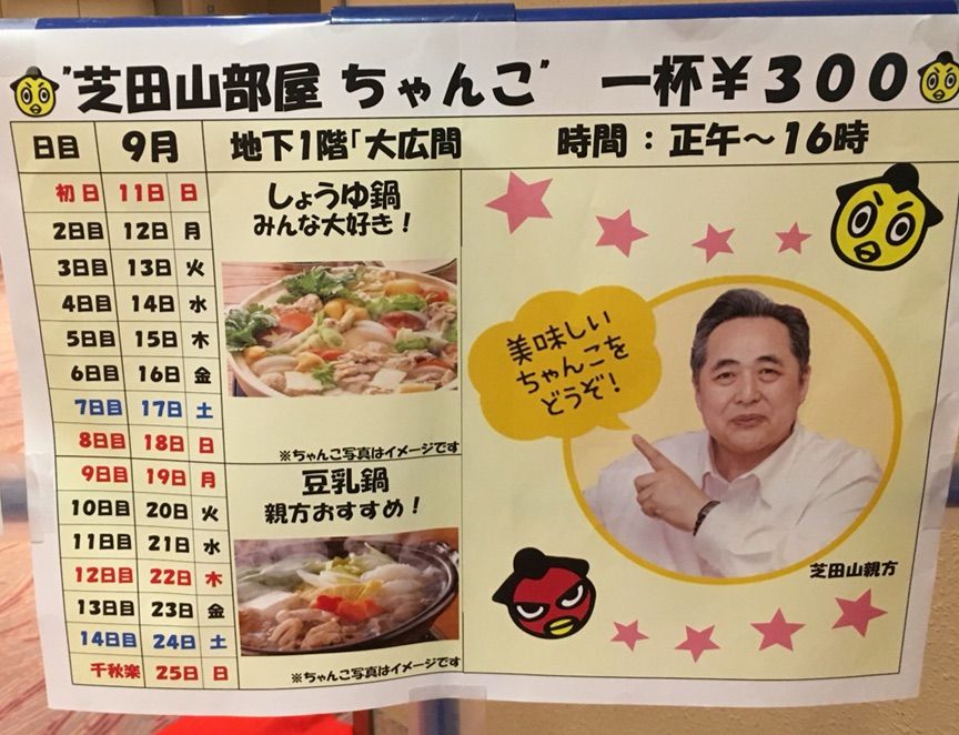 大相撲開催中の12時〜16時に地下の大広間にて、一杯300円で食べられます。(2016年9月現在)